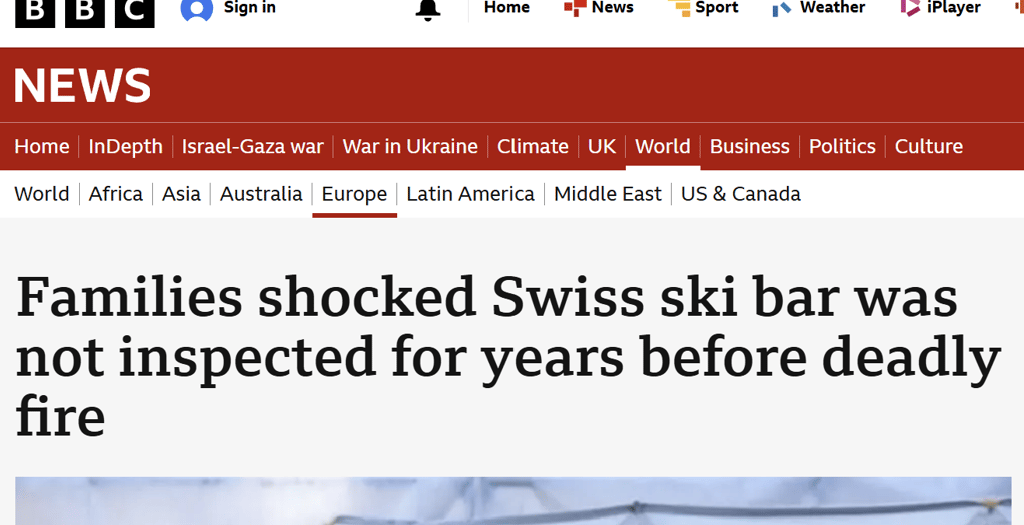 Post is about the Crans-Montana fire and the lack of fire risk assessment being completed.